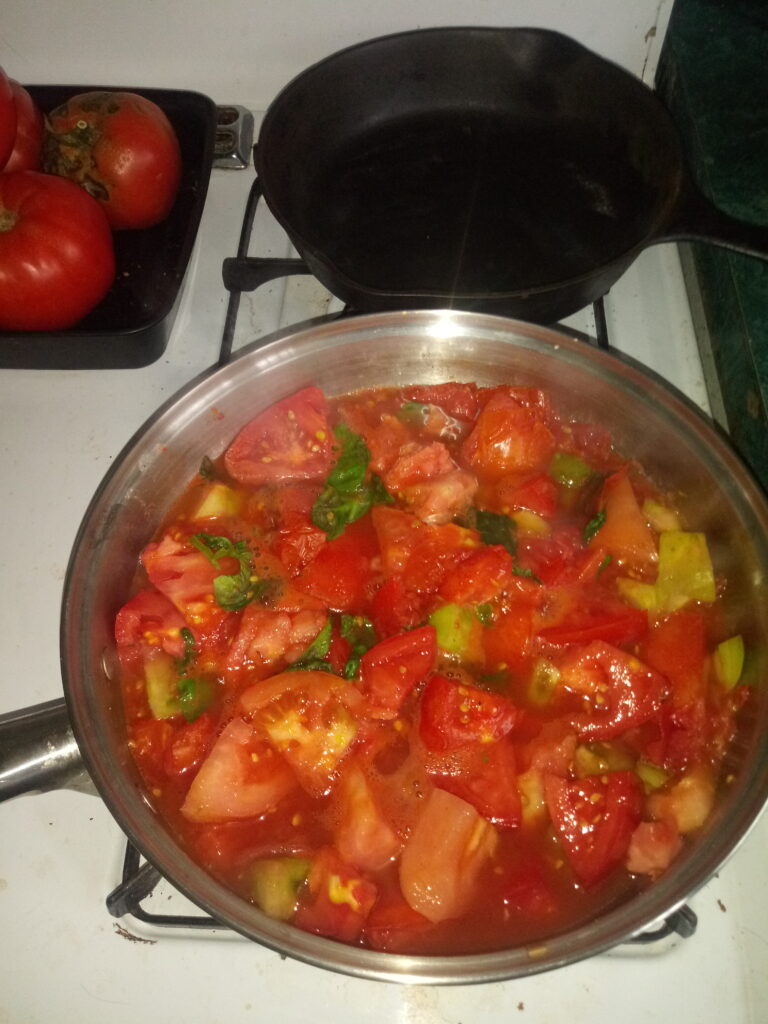 I had some tomato’s that were starting to go. So I chopped them up and threw them into the cast iron pan to cook down with some fresh basil and onions. Tomato’s don’t take that long to reduce. I cooked them for approximately 20 minutes on a medium simmer. While cooking the tomatoes throw in a pound or so of bacon in a second cast iron pan and fry until crispy. Also start toasting the rye bread slices. Salt and pepper to taste. Remember less is always better. It’s easier to add then subtract.